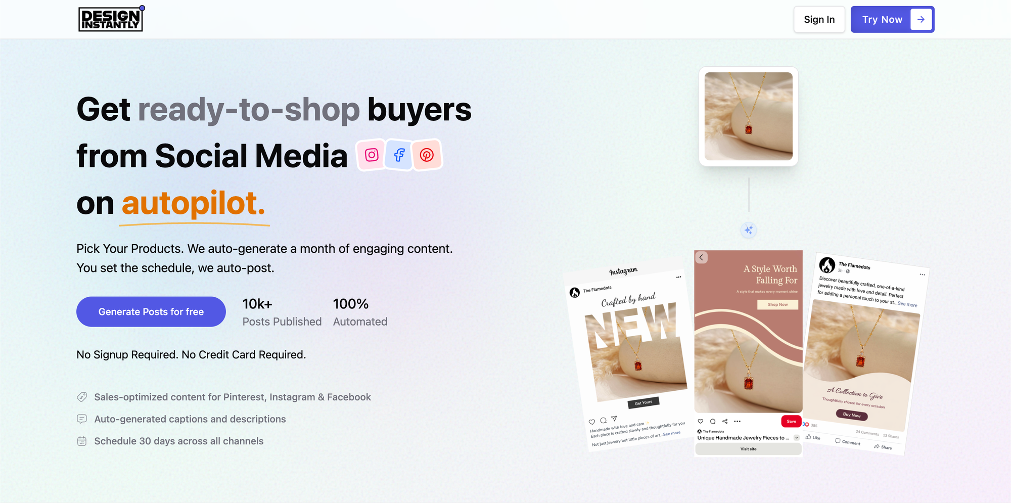 The other thing that separates this from basic scheduling tools is that you are not just automating posting. You are automating the design step. The content that comes out actually looks like a paid ad, not a screenshot from your Shopify backend. That visual quality gap is what most "set it and forget it" tools miss entirely. You can install Design Instantly directly from the Shopify App Store and have your first batch of posts ready in 10 mins.